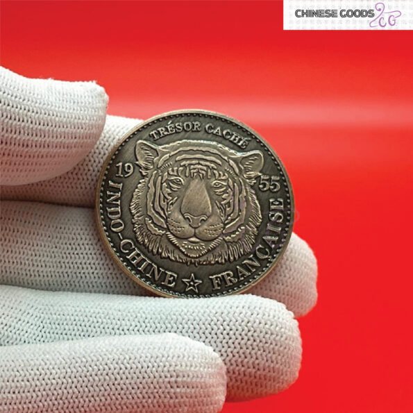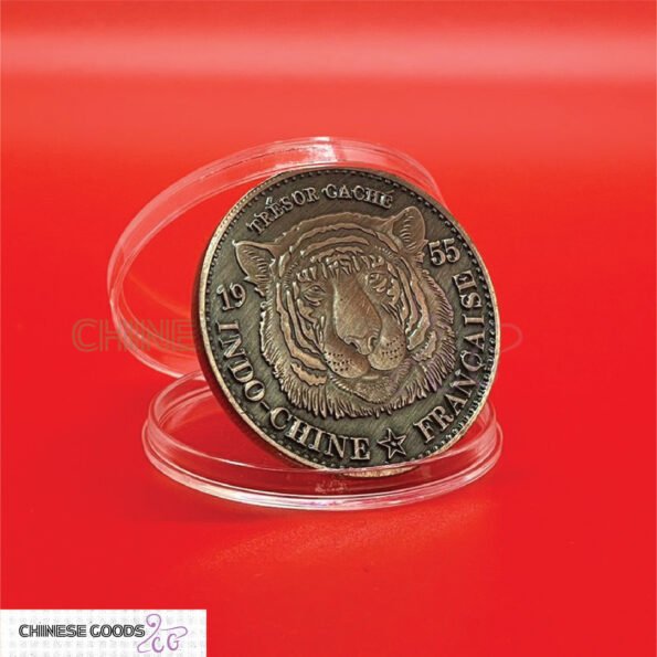 নকশা: একপাশে টাইগারের মুখ, “TRÉSOR CACHÉ 19 55 INDO-CHINE FRANÇAISE”; অন্যপাশে ওরাঙ্গুটানের মুখ চাইনিজ সাইন, তিনটি তারা এবং স্টাইলাইজড ক্রাউন সহ